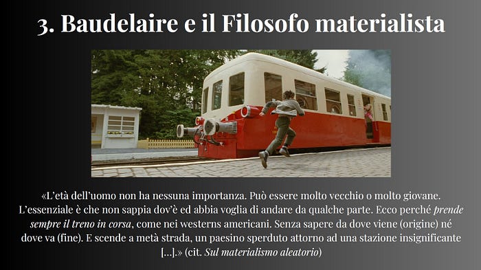 Vorrei infine proporre un accostamento tra due figure diverse di cui parlano Foucault e Althusser: rispettivamente, Baudelaire e il Filosofo materialista. Qui l’idea di “fare della propria vita un’opera d’arte” emerge con forza.
