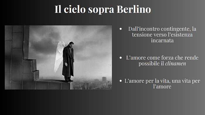 A partire da queste considerazioni, prima di passare a Foucault, vorrei esplicare questo concetto attraverso il meraviglioso film di Wim Wenders, Il cielo sopra Berlino (1987). I protagonisti di questo film sono degli angeli che vegliano sopra la città e sulle persone che la abitano, ma questi esseri angelici sono assolutamente invisibili all’uomo, non provano alcuna sensazione, non hanno un corpo, non toccano, non sentono, non vedono i colori… Possono solamente “poetare” in un certo senso, un poetare, un pensare, un meditare sulla vita umana, pur non avendo loro stessi una vita umana. E c’è questa tensione in un angelo in particolare, interpretato da Bruno Ganz. A Bruno Ganz non sta più bene la sua incorporeità, vuole la mortalità, vuole incarnarsi, vuole diventare corpo per sentire. E queste sensazioni mentali (perché non sono sensazioni che può provare naturalmente), ovvero la voglia di voler tendere all’esistenza e di volersi far corpo, derivano essenzialmente da degli incontri. Lo stesso voler prendere realtà di Bruno Ganz deriva dall’incontro con una donna, un incontro che però è unilaterale. Lei non vede lui: lo vede in sogno, si “incontrano” in un certo senso, ma non vi è un vero e proprio “incontro. L’esistenza di Ganz si trasforma così dall’essere un mero poetare sull’esistenza altrui ad un desiderio, una vera e propria tensione verso l’esistenza propria: “io voglio potermi sfregare le mani, voglio poter bere il caffè, fumarmi una sigaretta, voglio poter vivere la vita, esprimere il mio amore e la mia cura, esprimere la mia empatia realmente, in maniera incarnata, voglio vedere i colori, voglio sapere come si chiamano i colori, non voglio solo pensarli”. E quindi, attraverso questo incontro, letteralmente prende vita: ed è l’amore ad essere la forza propulsiva che rende possibile, in primis, la deviazione. E tale incontro è, ovviamente, assolutamente contingente: non c’è una teleologia, una ideologia dietro: “lui è il predestinato, l’anello mancante tra il materiale e lo spirituale, lui è l’uomo che unisce i due mondi…” No: lui ha semplicemente deciso che vuole esistere, desidera esistere, per l’amore: vuole l’amore per la vita, provare l’amore per la vita, e vuole una vita per l’amore, una vita per amare.