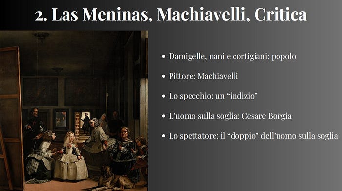 Sulla base di questi assunti di partenza, vediamo come, sulla scorta e al netto dell’interpretazione Foucaultiana, si può dare un’interpretazione originale di Las Meninas, come esemplificazione di questi concetti.