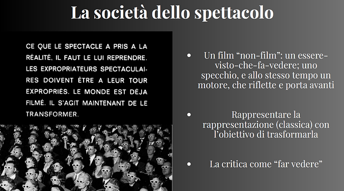Per riassumere in una frase l’obiettivo critico di Debord nel suo film-non film (che definirei più che altro “un essere-visto-che-fa-vedere; uno specchio, e allo stesso tempo un motore, che riflette e porta avanti): “La società è già stata filmata; si tratta ora di trasformarla”.