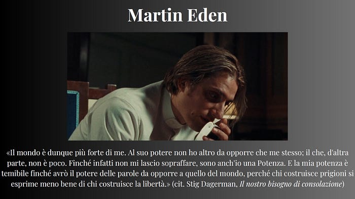 In ultimo, vorrei proporre un ulteriore accostamento di queste figure con quella di Martin Eden, personaggio dapprima del romanzo di Jack London, e poi “rivisitato” da Pietro Marcello per il suo film. Interpretato da Luca Marinelli, Martin Eden incarna entrambe le figure di Baudelaire e del filosofo materialista althusseriano. Vorrei dunque concludere omaggiando quello che è il mio film preferito, riportandone il breve monologo iniziale (che in realtà è un estratto di un testo di Stig Dagerman, intitolato Il nostro bisogno di consolazione, che riutilizza come “scritto proprio” anche più avanti nel film, in quanto lo stesso Martin Eden “è” Stig Dagerman, in un certo senso), che credo si sposi bene anche con la filosofia foucaultiana: